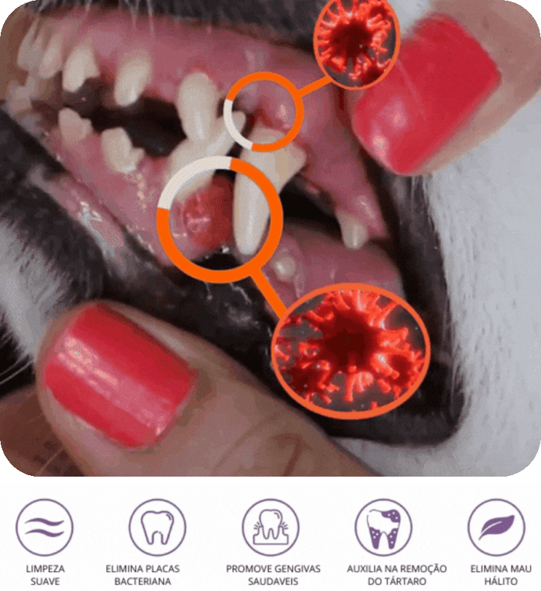 Ofereça uma solução simples e prática à escovação tradicional, tornando a higienização bucal do seu pet mais conveniente e eficaz. Previna o tártaro, combata o mau hálito e promova gengivas saudáveis com facilidade.